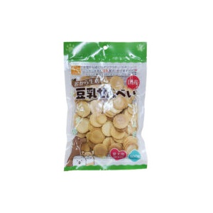 大豆たんぱくやイソフラボン、サポニン、レシチンを含む豆乳配合。 甘さ控えめのカリッと焼き上げたせんべいです。 【与え方】 ・1日あたりの給与量は種類や体重、年齢、運動量等によって異なります。 ・生後6ヶ月未満(歯が生え揃っていない時期)には与えないでください。 ・のどにつまらせないよう注意してお与えください。 【保存方法】 ・直射日光、高温多湿の場所を避けて常温保存してください。 ・開封後は吸湿しやすいので賞味期限にかかわらず、なるべくお早めにお与えください。 【注意】 ・本品は犬用です。犬以外には与えないでください。 ・与え方の給与量をお守りください。 ・幼児や子供の手の届かない所に置いてください。 ・保存方法をお守りください。 ・子供が与える時は、大人の看視のもとで行ってください。 ・本品は製造過程上、割れが発生する場合がございます。 ・消化不良など愛犬の体調が変わった時は、獣医師にご相談ください。