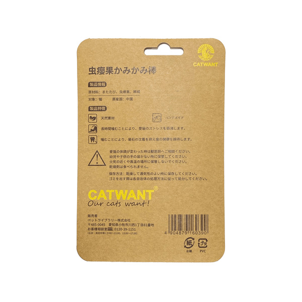 虫えい果とまたたびを使用した玩具です。猫ちゃんが噛む事でデンタル効果が期待できます。またたびと虫えい果好きな猫ちゃんへ!