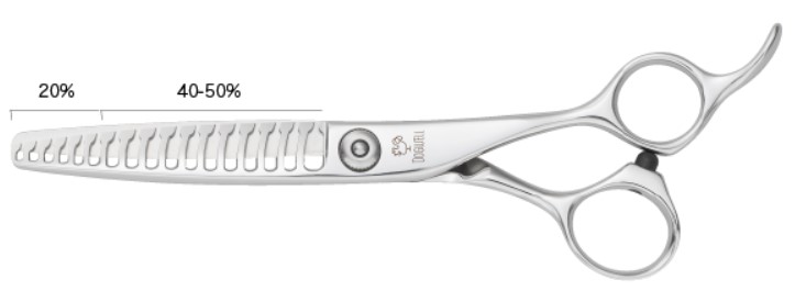 先端(6目)は約20%、中間から根元(11目)では約40~50%の毛量調整が可能です。 先端のカット率が低いため、顔・関節回りの神経を使う場面でもシザーズを持ち替えずにカットできます。 フラットな櫛形状により、引っかかりが少なく、フワフワ感を簡単につくり出せます。 縦に入れても引っかかりが少ないため、毛並みの束感を簡単につくり出せます。 チッピングにも最適です。