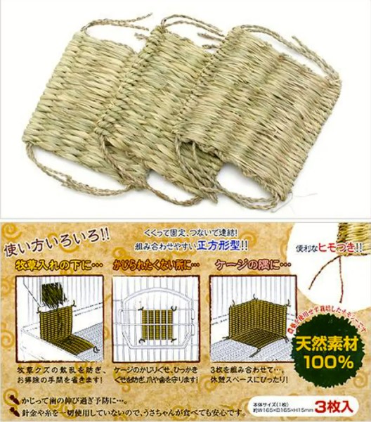 [対象]うさぎ モルモット チンチラ[特長]農薬を使用せず栽培したチモシーを使用して作られた、安心安全のおざぶ3枚セットです。四隅にヒモがついているのでケージや床に固定したり、つないで使用したり、汚れた1枚だけを交換することができます。また、かじって壊すことにより、歯の伸びすぎを予防したり、ストレス発散に役立ちます。針金や糸を一切使用していないので、ペットが食べても安全です。牧草入れの下におくことで、牧草くずの散乱を防ぎ、お掃除の手間も省きます。かじられたくない所におくことで、ケージのかじりぐせ、ひっかきぐせを防ぎ、爪や歯を守ります。ケージの隅におき、3枚を組み合わせて休憩スペースにもできます。[数量]3枚入り[サイズ(約)]幅165×奥行き165×高さ15mm※手作りのため、サイズは多少誤差があります。