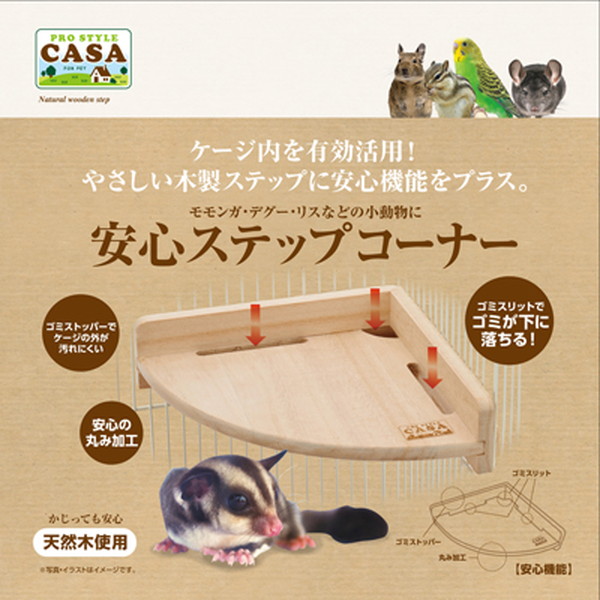 【商品説明】コーナーに設置できケージ内を広く使える天然木のステップ。
