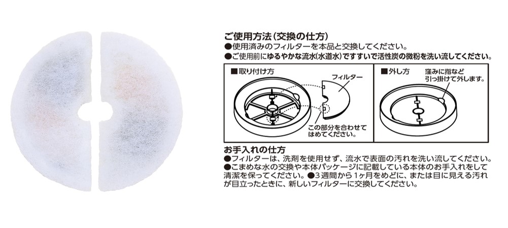 ・水素還元セラミックボール+イオン交換樹脂 水素を発生し、水を軟水化することで健康維持をサポート!・抗菌活性炭で菌の繁殖を防ぎカルキ臭を吸着・フィルターで食べカス・抜け毛・ホコリなどをろ過容量: 2回分規格: 【材質】PP・抗菌活性炭・イオン交換樹脂・水素還元セラミックボール本体サイズ(mm): W74xD35xH5対象動物: 猫