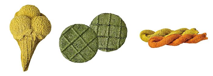 アイスクリームクッキー:チモシー、小麦粉、かぼちゃ、リンゴ、オリゴ糖、着色料(黄4)/ワッフルせんべい:チモシー、小麦粉、オリゴ糖、着色料(緑色3)/あみあみクッキー:チモシー、小麦粉、かぼちゃ、にんじん、オリゴ糖、着色料(黄5、緑色3)