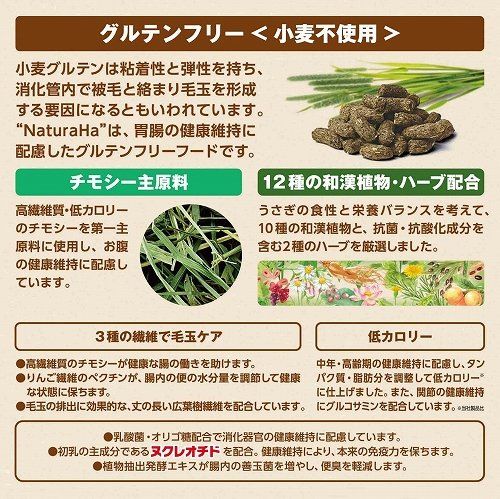 ・チモシーを主原料に、グルテンフリーに仕上げたうさぎの為のフードです。・うさぎの食性と栄養バランスを考えて10種の和漢植物と2種のハーブを配合しました。・毛玉の形成を抑えて排出を助ける天然食物繊維を強化配合。さらにタンパク質を分解する働きのあるパパイン酵素を配合しました。※メンテナンス・シニアと比べて保存料・合成酸化防止剤・着色料不使用