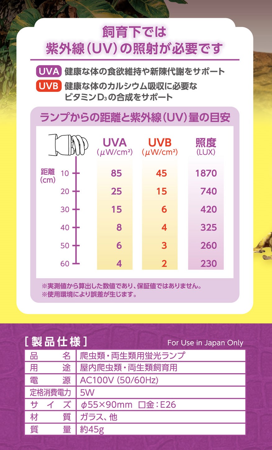弱い紫外線を必要とするヒョウモントカゲモドキなどの爬虫類、ツノガエルなどの両生類にもおすすめです。