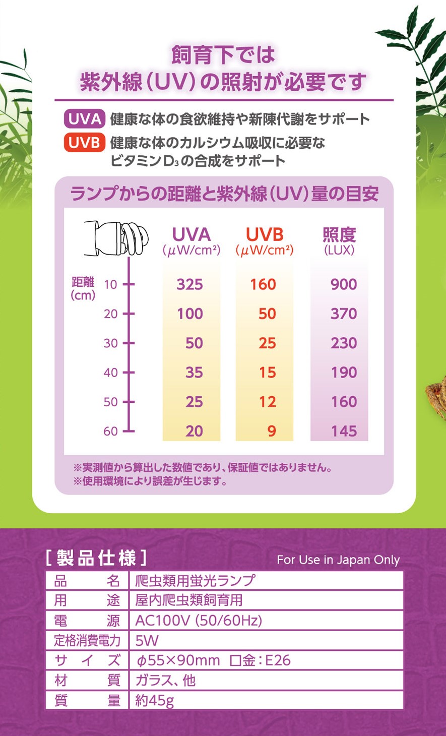 【使用上の注意】●本品は爬虫類・両生類用です。他のペットまたは人には使用しないでください。 ●ランプには水やおしっこなどがかからないように気をつけてご使用ください。 ●使用中の熱くなったランプに水などがかかるとヒビ割れや破損の原因になります。 ●取り付け、取り外しや器具の清掃の際は、必ず電源を切ってください。 ●落としたり、ぶつけたりなどの過度な衝撃を与えないでください。破損によるケガの原因になります。 ●ランプが破損した場合でも内部には電気が通っていることがありますので、必ず電源を切ってから交換してください。 ●使用済みのランプは割らずに燃えないゴミとして捨ててください。 ●お子さまの手の届かないところに保管してください。●ランプに汚れ・油脂分・フンなどが付着すると一部が高温になり割れることがありますのでご注意ください。 ●長時間照射するとプラスチック等が劣化することがありますのでご注意ください。●繰り返しの振動等でソケットとの接続部分が緩む可能性がありますので定期的に確認してください。●頻繁に電源のON/OFFを繰り返すと、ランプの寿命に影響しますのでご注意ください。