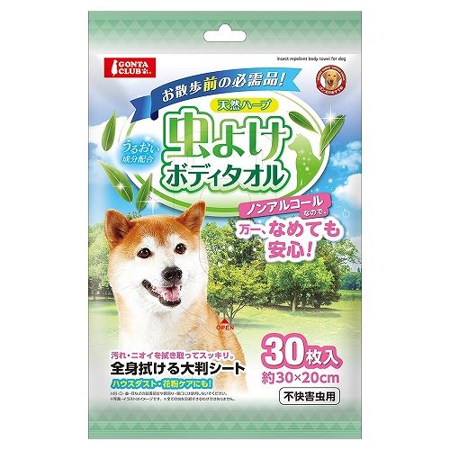 お散歩前の必需品! 全身拭ける大判シート・天然ハーブ配合で虫よけ効果があるボディタオルだから、お散歩前・お散歩の合間に全身を拭くことでイヤな虫をよせつけません。・汚れ・ニオイ・抜け毛を絡めて拭き取る特殊メッシュシートで全身スッキリ!・うるおい成分のビサボロール配合で皮膚・被毛にツヤとハリを与えます。※顔周りには使用しないでください。