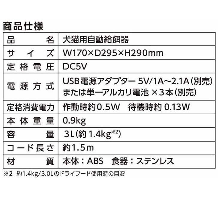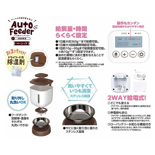 除湿剤入れ付き、洗いやすいステンレス食器、フードタンクと羽根車部分が取り外しカンタン洗える仕様。(除湿剤おまけ付き・アダプター無し)●給餌量・時間らくらく設定 1日4回設定OK(最大約360gまで)●衛生的なステンレス食器●フードタンク、羽根車、食器取り外し水洗いOK●録音機能付き