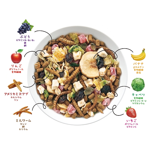 動物性タンパク質に加え、骨・関節の健康維持にビタミン・ミネラルを バランスよく摂れる素材をミックスしました。 <栄養バランスペレット> 昆虫・果実・野菜の成分をバランスよく配合した、食べやすい小粒タイプのペレットです。 <生きた乳酸菌配合> 乳酸菌が腸内フローラのバランスを整え、消化器官の健康維持をサポートします。 <便臭を軽減> 植物抽出発酵エキスが腸内の善玉菌を増やし、便臭を軽減します。 <丈夫で健康なカラダの維持に> ビタミンD3・タウリン・カルシウムを配合