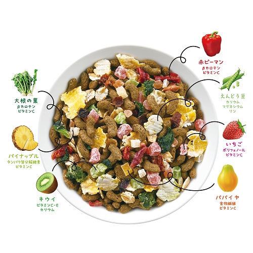 動物性タンパク質に加え、皮膚の健康を保つビタミン・ミネラルを豊富に含む素材をミックスしました。 <栄養バランスペレット> 昆虫・果実・野菜の成分をバランスよく配合した、食べやすい小粒タイプのペレットです。 <生きた乳酸菌配合> 乳酸菌が腸内フローラのバランスを整え、消化器官の健康維持をサポートします。 <便臭を軽減> 植物抽出発酵エキスが腸内の善玉菌を増やし、便臭を軽減します。 <丈夫で健康なカラダの維持に> ビタミンD3・タウリン・カルシウムを配合