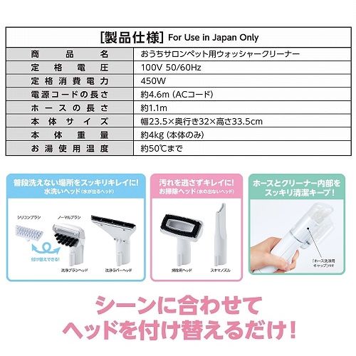 ペット用品(ベッド・マット・おもちゃ)・カーペット・ソファーなどの洗浄にシーンに合わせてヘッドを付け替えるだけ!●水洗いヘッド( 水が出るヘッド)普段洗えない場所をスッキリキレイに!●お掃除ヘッド(水の出ないヘッド)汚れを逃さずキレイに!