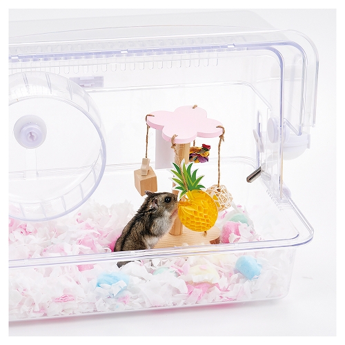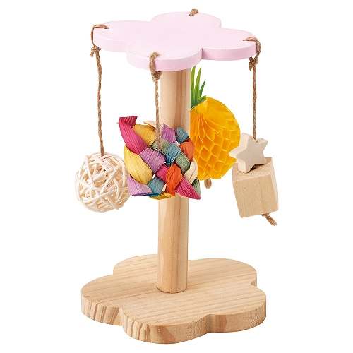 ゆらゆら揺れるチャームを追いかけたり、かじったりして遊べる、 くるくる回るメリー型のおもちゃです。 チャームの中におやつを入れて楽しくコミュニケーションを取ることができます。 ケージ内をかわいくデコレーションできます。