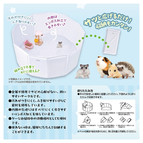 広げたらそのまま使える安心サークルです。 ・金属不使用でサビの心配がない、扱いやすいサークルです。 ・汚れがつきにくく、ふき取りやすいPVC素材を使用しています。 ・内側の生地には歩きやすいエンボス加工を施しています。 ・ケージお掃除中の待機場所としても便利です。 ・使わない時は、簡単にたたんで収納することができます。