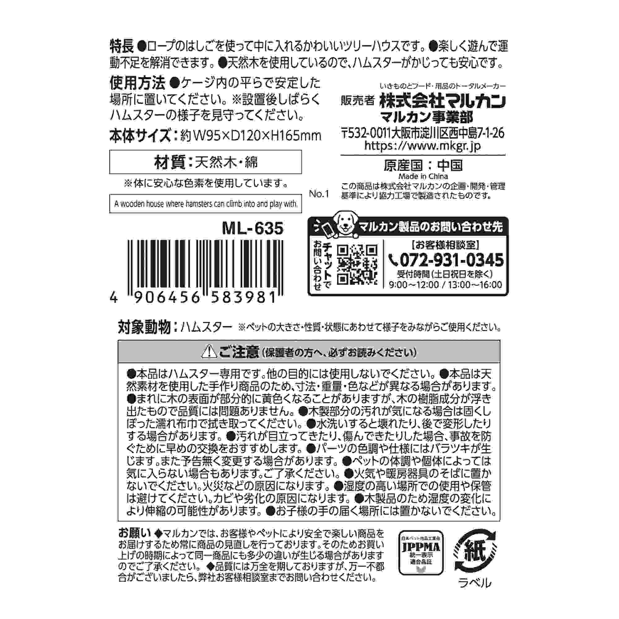 ●本品はハムスター専用です。他の目的には使用しないでください。 ●本品は天然素材を使用した手作り商品のため、寸法・重量・色などが異なる場合があります。 ●まれに木の表面が部分的に黄色くなることがありますが、木の樹脂成分が浮き出たもので品質には問題ありません。 ●汚れが目立ってきたり、傷んできたりした場合、事故を防ぐために早めの交換をおすすめします。 ●パーツの色調や仕様にはバラツキが生じます。また予告無く変更する場合があります。 ●ペットの体調や個体によっては気に入らない場合もあります。ご了承ください。 ●木製品のため湿度の変化により伸縮の可能性があります。 ●お子様の手の届く場所には置かないでください。 ● ケージ内の平らで安定した場所に置いてください。 ※設置後しばらくハムスターの様子を見守ってください。