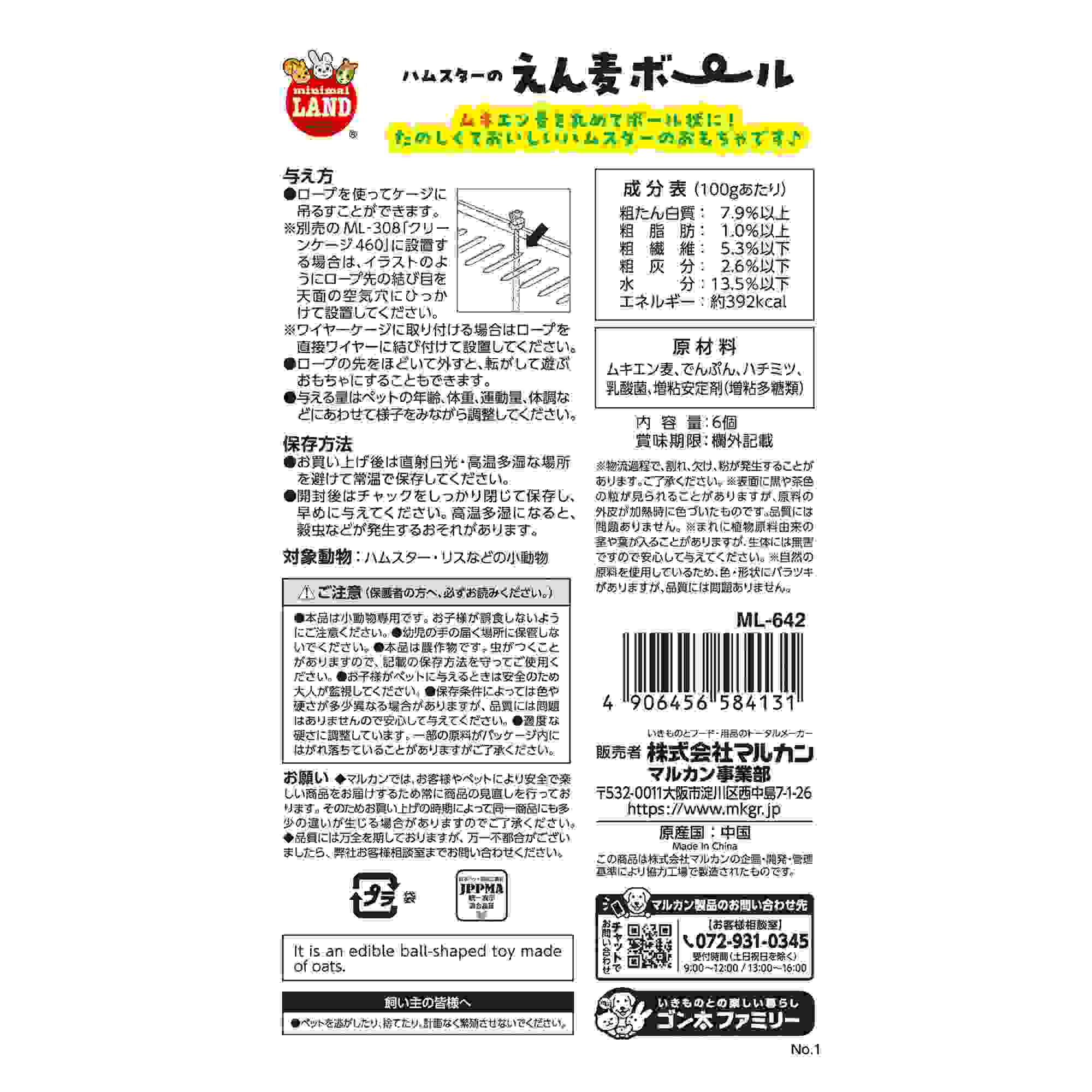 ミニマルランド ハムスターのえん麦ボール 6個