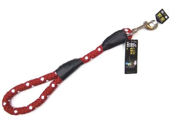 パイレンに反射材を織り込みました。夜間、車のライトなどに反射して光るので、夜の散歩も安心。短いリードで、大型犬のコントロールに最適。首輪のDカンにリードのスナップを取りつけてください。
