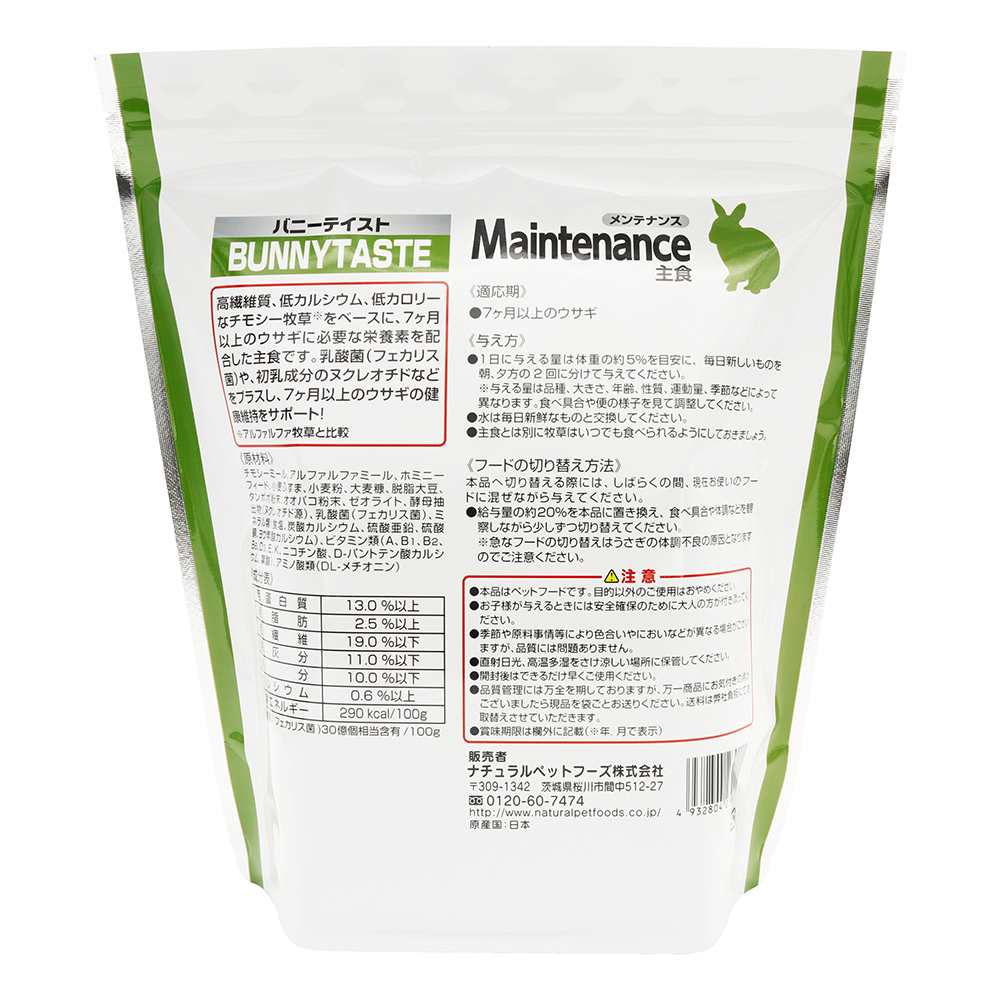《与え方》●1日に与える量は体重の約5%を目安に、毎日新しいものを朝、夕方の2回に分けて与えてください。※与える量は品種、大きさ、年齢、性質、運動量、季節などによって異なります。食べ具合や便の様子を見て調整してください。●水は毎日新鮮なものと交換してください。●主食とは別に牧草はいつでも食べられるようにしておきましょう。《フードの切り替え方法》本品へ切り替える際には、しばらくの間、現在お使いのフードに混ぜながら与えてください。●給与量の約20%を本品に置き換え、食べ具合や体調などを観察しながら少しずつ切り替えてください。※急なフードの切り替えはうさぎの体調不良の原因となりますのでご注意ください。