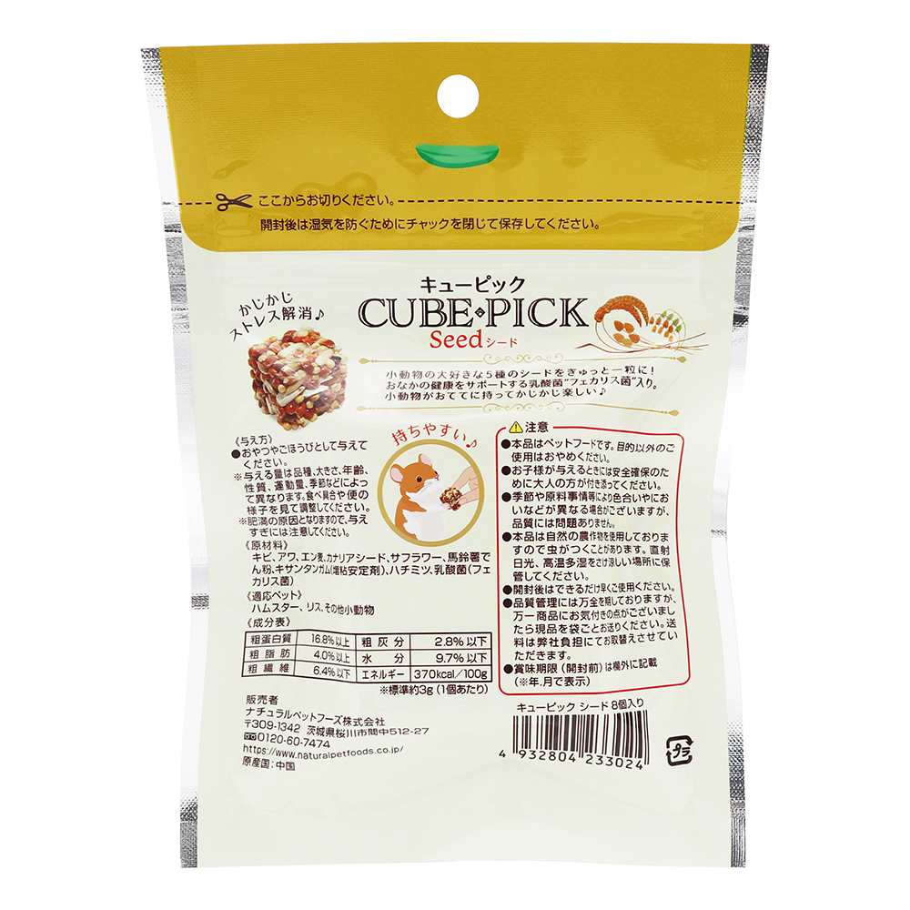 キューブ型のつまめるおやつ。小動物の大好きな5種のシードをぎゅっと一粒に!おなかの健康をサポートする乳酸菌“フェカリス菌”&ハチミツ入り。小動物がおててに持ってかじかじ楽しい!かじることでストレスの解消、歯の健康維持をサポート!手から与えることでコミュニケーションツールにも。