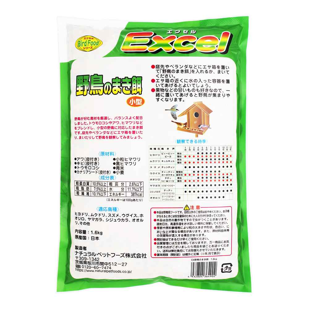 野鳥が好む素材を厳選し、バランスよく配合しました。トウモロコシやアワ、ヒマワリなどをブレンドし小型の野鳥に対応したまき餌です。庭先やベランダなどにエサ箱を置いたり、まいたりして野鳥を観察してください。