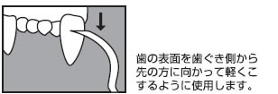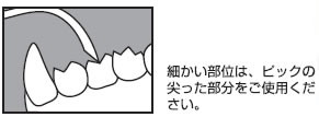 ピックは軽くこするだけで歯に付着した歯垢、着色ヨゴレを除去します。 歯ぐき側から歯の咬合側にピックを移動させるように使用すると安全です。 2種類のピックを使い分けて、効果的にヨゴレを除去してあげて下さい。
