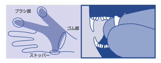 【使用方法】 ・ゴム部から手を通し、親指と人差指に「ブラシ部」をはめ、 「ストッパー」を中指を・薬指・小指を通して装着します。 ・歯磨きは、指の腹部分で、歯と歯ぐき、また、その境目を丁寧に擦るようにします。 ・また、歯の表部と裏部を親指と人差し指ではさんで擦ることによって、 歯の両面を同時に歯磨きすることができます。 ・本品は、右手・左手の両方で使用できます。 ・両手で同時に使用することも可能です。