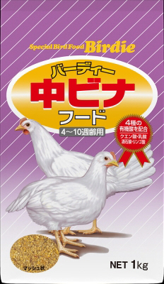 【バーディー中ビナフード1kg】●4~10週齢の中ビナ用すこやかメニュー。●ニワトリ、キジ、ホロホロ鳥などのヒナ用フードとしても使えます。●腸内細菌のバランスを整える4種の有機酸を配合!(クエン酸・乳酸・酒石酸・リンゴ酸)●有機酸が胃酸成分を補助し、消化を助けます。●ミネラルの吸収を助ける酵素(フィターゼ)を配合。●栄養成分が豊富なビール酵母を配合し、ヒヨコの健康に配慮しました。●抗菌性飼料添加物は使用していません。