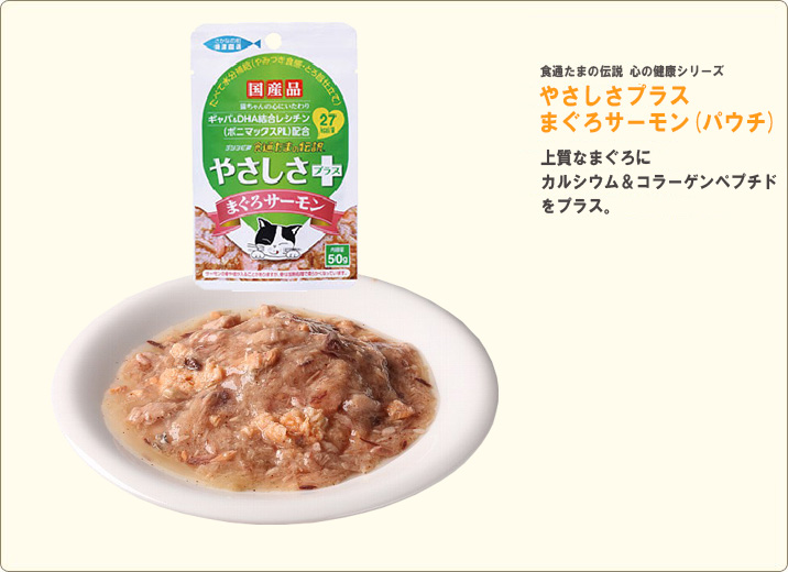 グルメなネコちゃんの大好物、サーモンをトッピングした上質なまぐろに、カルシウム&コラーゲンペプチドをプラス。水分たっぷりなので、水分不足になりがちな猫ちゃんにも安心。