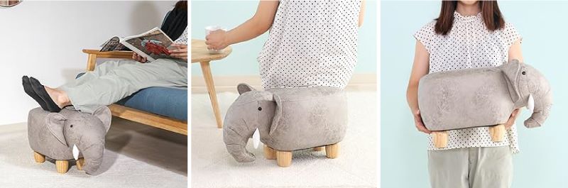 可愛らしいフェイスのゾウさんのスツール。コンパクトなキュートサイズで場所を取らず、軽量で持ち運び簡単!27㎝と低めの設計でお子さんも安心して使用できます。スツールとしてでなく、ソファに座る際のオットマンとしてもご利用できます。脚にはフェルトがついており、床を傷つけるのを防ぎます。