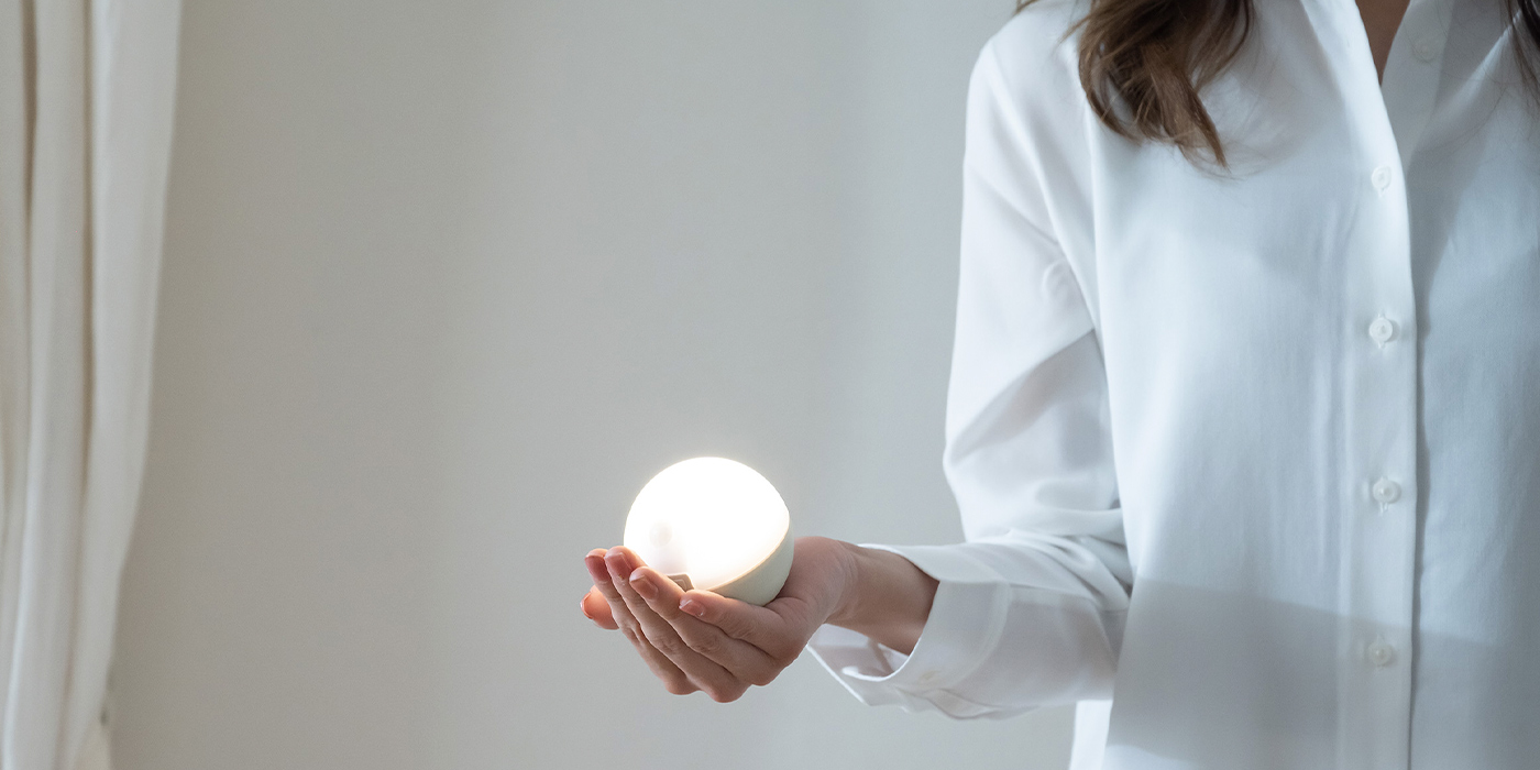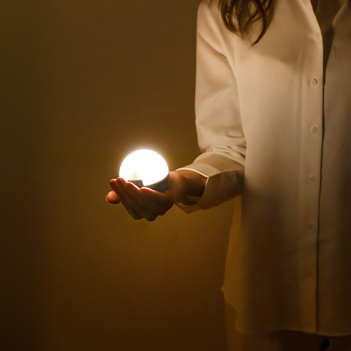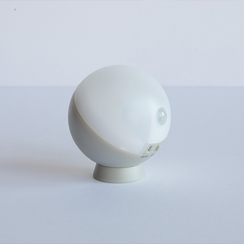 女性の手の中におさまる丸いライトです。 人を感知するセンサーがついていますので近づくとフワッとライトがやさしく点灯します。 使い方いろいろ、欲しいところにあかりを届けます。