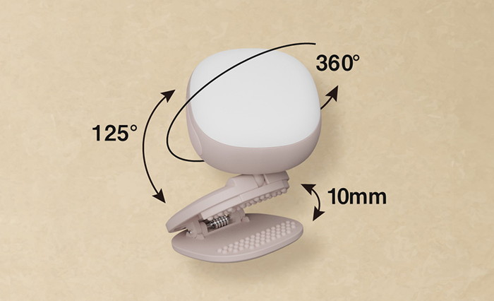 ライト角度・自由自在 しっかりつかめるクリップ。すべり止めは丸い形状で、衣服を痛めません。