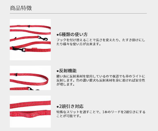 1本で150/100cmのリードや、たすき掛け、2頭引きや、長/短の仮の係留にも使えるリード。リード部分は2重になっており丈夫です。小型犬用に細く長く、そして軽くなりました。反射機能付。※使用方法によっては耐荷重内でも対応できない場合があります。