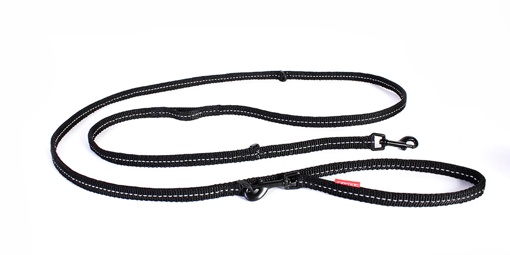 1本で150/100cmのリードや、たすき掛け、2頭引きや、長/短の仮の係留にも使えるリード。リード部分は2重になっており丈夫です。小型犬用に細く長く、そして軽くなりました。反射機能付。