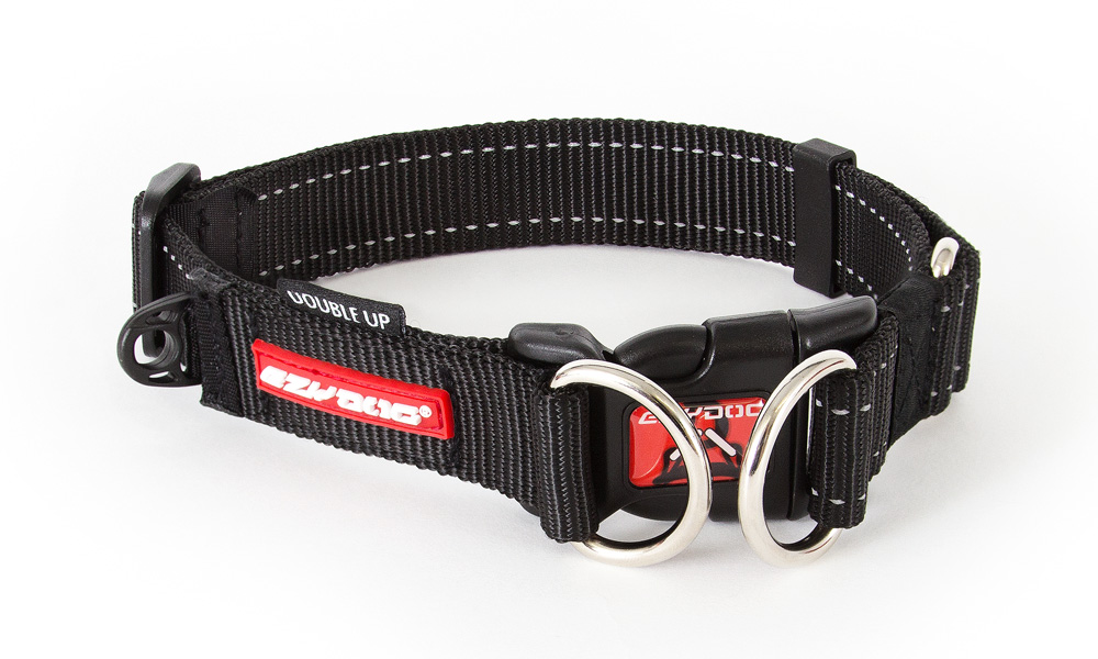 1つのバックルと2つのリングで二重ロック。ソフトな肌触りでありながら耐久性を持つ素材を使用、サイズ調整可能。反射機能付。