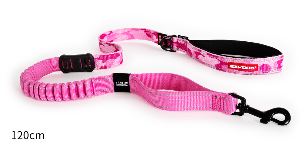 ショック吸収機能付きで愛犬の首やオーナー様への負担が軽減されるリード。反射機能付。※グリーンカモ・ピンクカモは、リードの一部が単色になります。