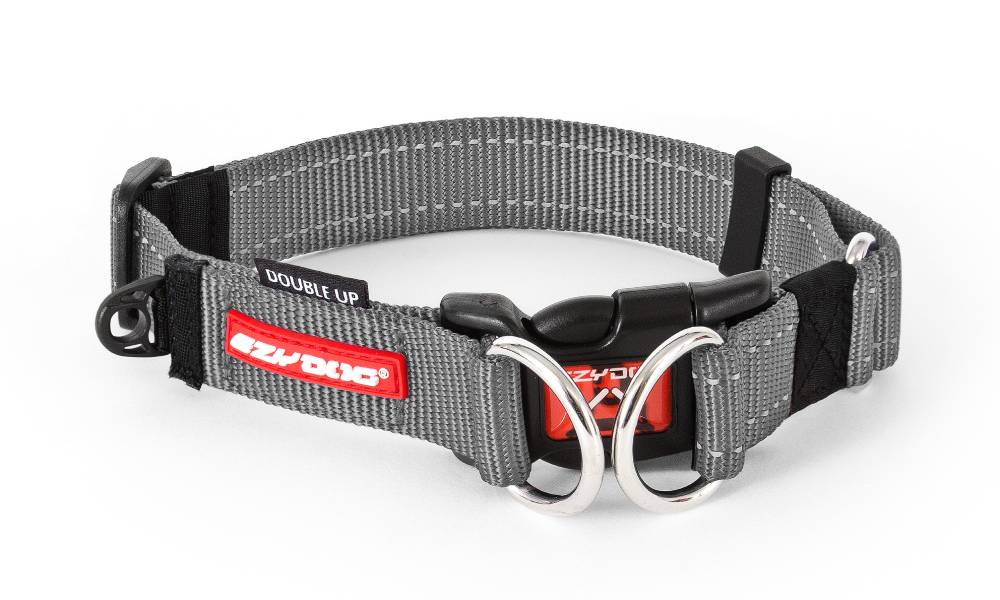 1つのバックルと2つのリングで二重ロック。ソフトな肌触りでありながら耐久性を持つ素材を使用、サイズ調整可能。反射機能付。