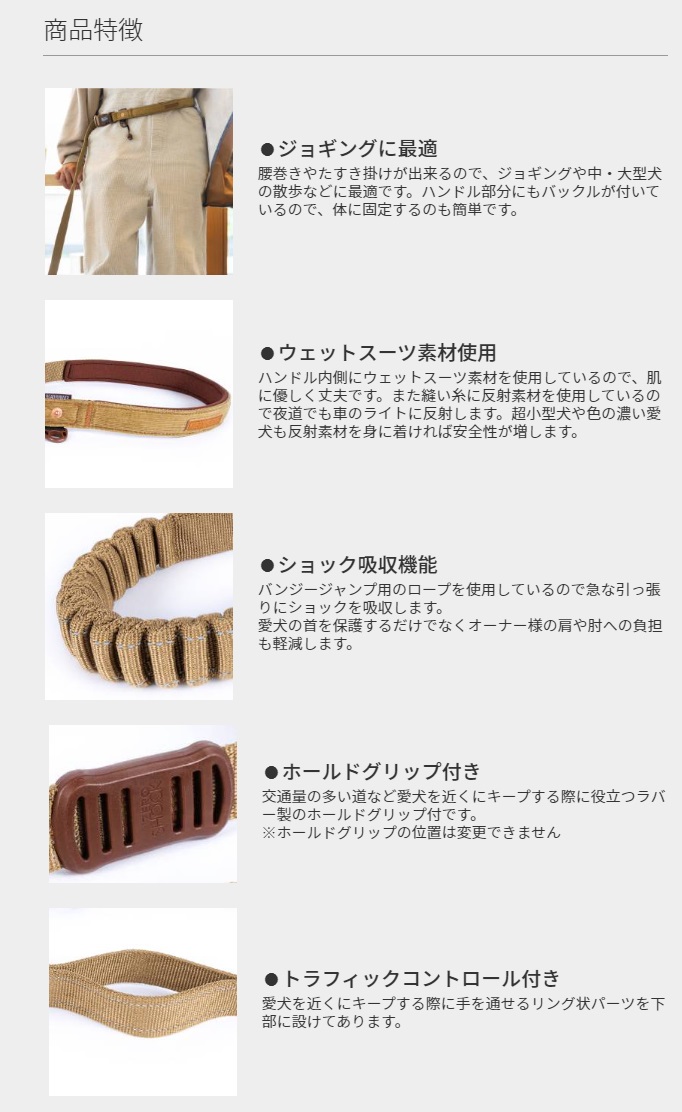 腰に巻くタイプのリードショック吸収機能付きで愛犬の首やオーナー様への負担が軽減される腰に巻くタイプのリード。腰に当たる部分がウェットスーツ素材で優しい。リード装着部分は長さ調整ができ、たすき掛けも可能。ジョギングやトレーニングにも最適。反射機能付。