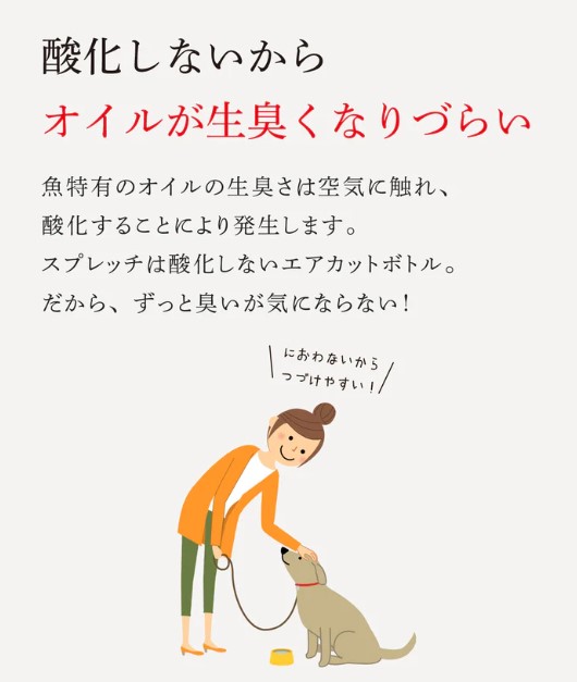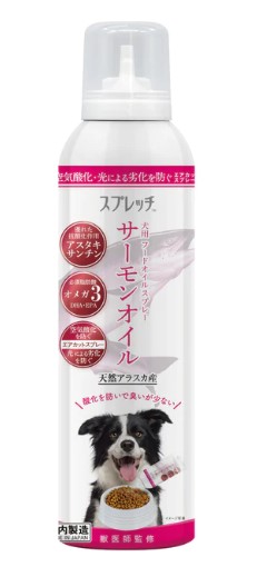 必須脂肪酸「オメガ3」を毎日の食事に手軽に取り入れられる「スプレッチ」シリーズからサーモンオイルが新発売。愛犬の【皮膚、毛艶】【心臓、血管、血液】【関節、足腰】【脳、眼】の健康サポートに。特徴・天然アラスカ産サーモンを使用・アスタキサンチン、オメガ3(DHA・EPA)を含む良質なオイル・オイルの空気酸化、光による劣化を防ぐエアカット(特許出願中)ボトル・オイルが酸化しないから生臭くなりづらい・いつものごはんにかけるだけ!カンタン・手軽だから続けやすい・開封後も常温で保管可能