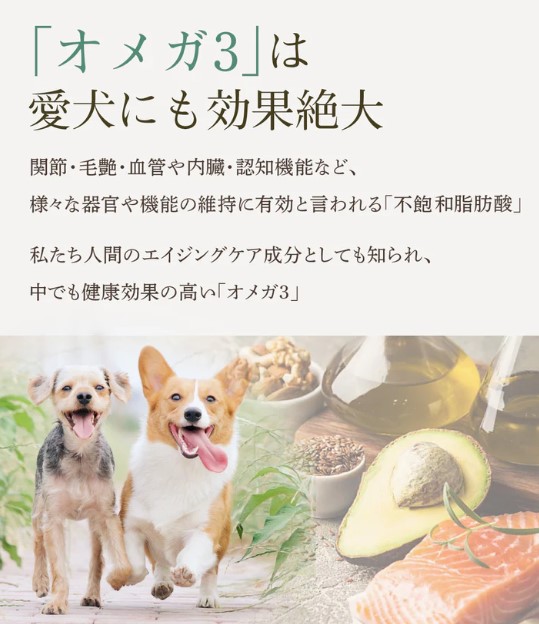 愛犬の【皮膚、毛艶】【心臓、血管、血液】【関節、足腰】【脳、眼】の健康サポートに。