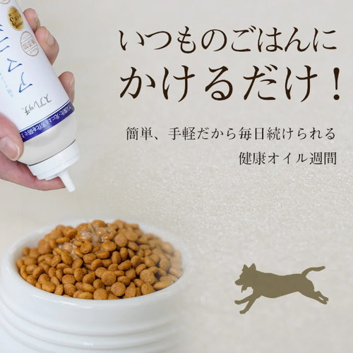 使いやすいスプレッチのMINIサイズ。毎日続ける、愛犬・愛猫のための健康新習慣。オメガ3(α-リノレン酸)を含む良質なオイルを手軽に摂取。愛犬・愛猫の【皮膚、毛艶】【心臓、血管、血液】【関節、足腰】【脳、眼】の健康サポートに。■特徴■・オイルの空気酸化、光による劣化を防ぐエアカット(特許出願中)スプレー・酸化防止剤 無添加・コールドプレス低温圧搾にて抽出したオイル■与え方■目安給与量を参考に1日、1回から数回に分けて与えてください。<給与量(1日あたり)>超小型犬(5kg以下) ・・・ 小さじ 1/2杯小型犬(5~10kg) ・・・ 小さじ 1/2~1杯中型犬(10~20kg) ・・・ 小さじ 1~2杯大型犬(20kg以上) ・・・ 小さじ 2~3杯