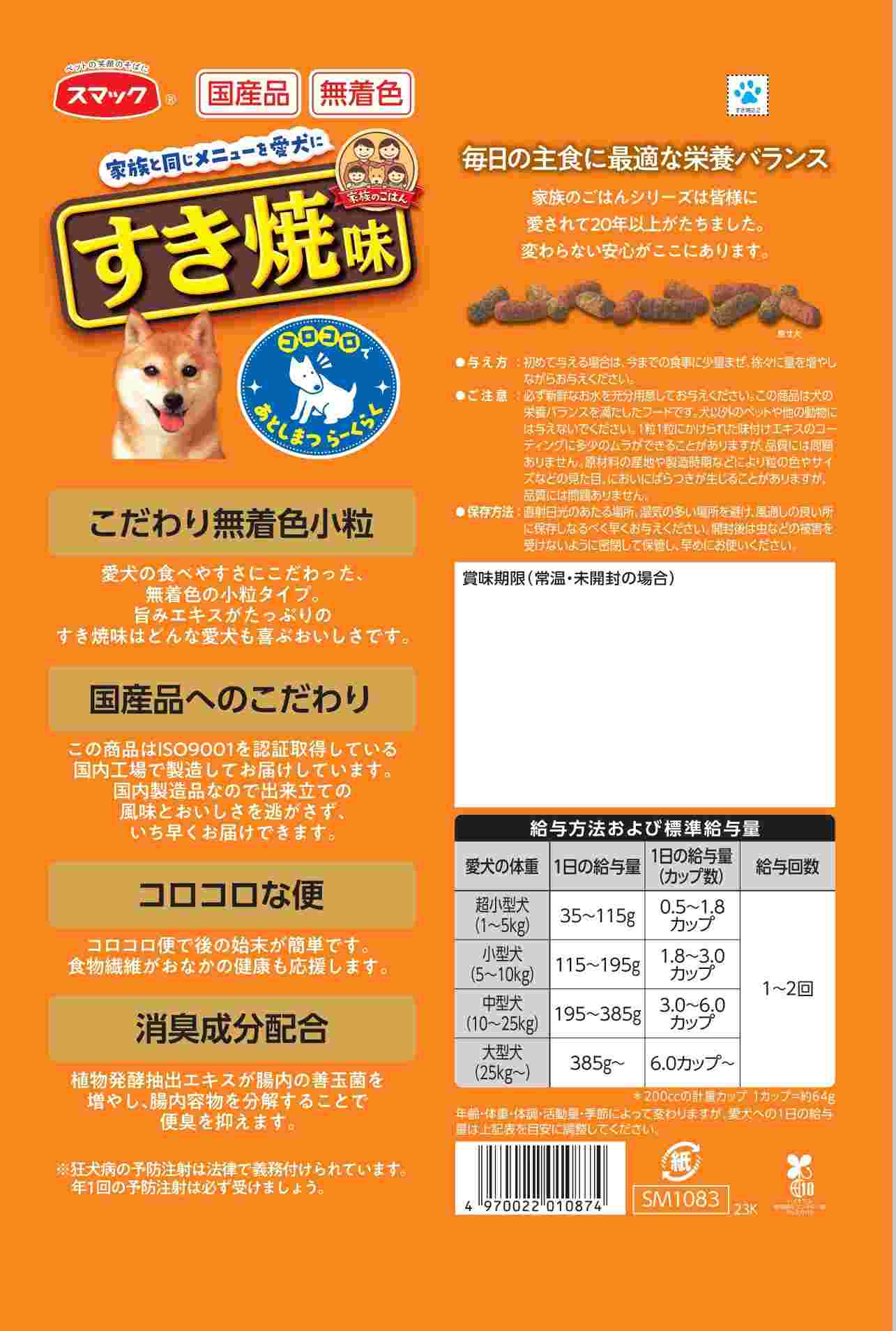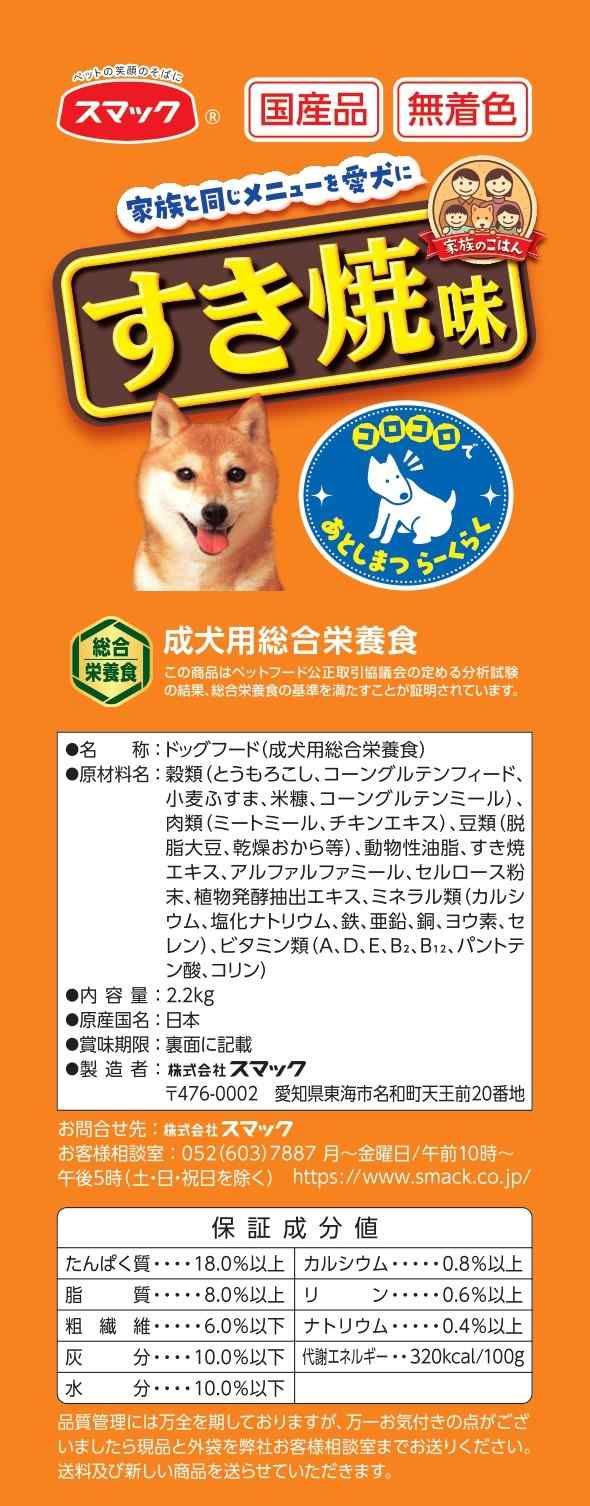 愛犬のお食事に自分と同じ美味しいメニューを。そんな声にお応えして、 みんなが大好きな「すき焼味」のフードに仕上げました。愛犬にとって必要な栄養素がバランス良く配合されているので主食として最適です。