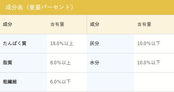 穀類(とうもろこし、コーングルテンフィード、小麦ふすま、米糠、コーングルテンミール)、豆類(脱脂大豆、乾燥おから等)、肉類(ミートミール、チキンエキス)、動物性油脂、すき焼エキス、アルファルファミール、セルロース粉末、植物発酵抽出エキス、ミネラル類(カルシウム、塩化ナトリウム、鉄、亜鉛、銅、ヨウ素)、ビタミン類(A、D、E、B2、B12、パントテン酸、コリン)
