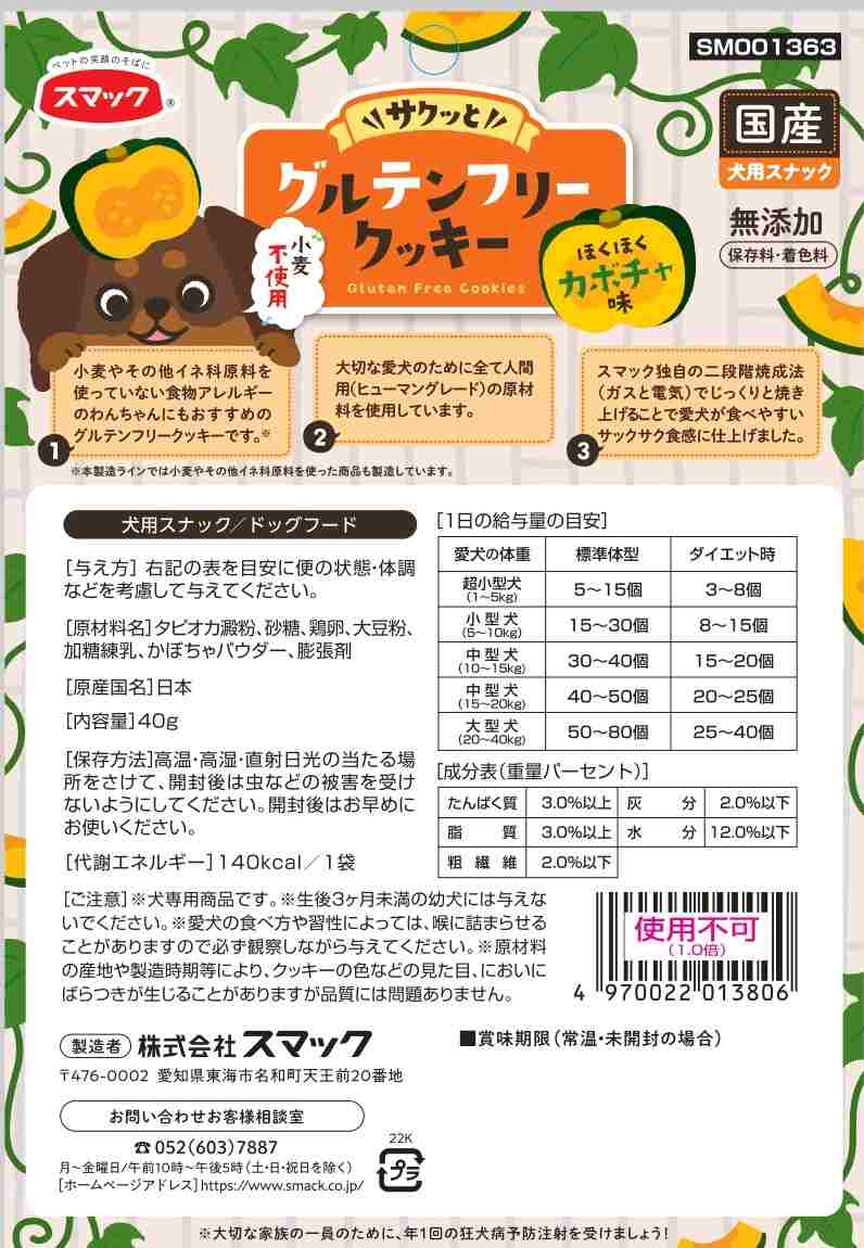 大切な愛犬のために全て人間用(ヒューマングレード)の原材料を使用し、小麦やその他イネ科原料を使っていない食物アレルギーのわんちゃんにもおすすめのかぼちゃ味のグルテンフリークッキーです。スマック独自の二段階焼成法(ガスと電気)でじっくりと焼きあげることで愛犬が食べやすいサックサク食感に仕上げました。