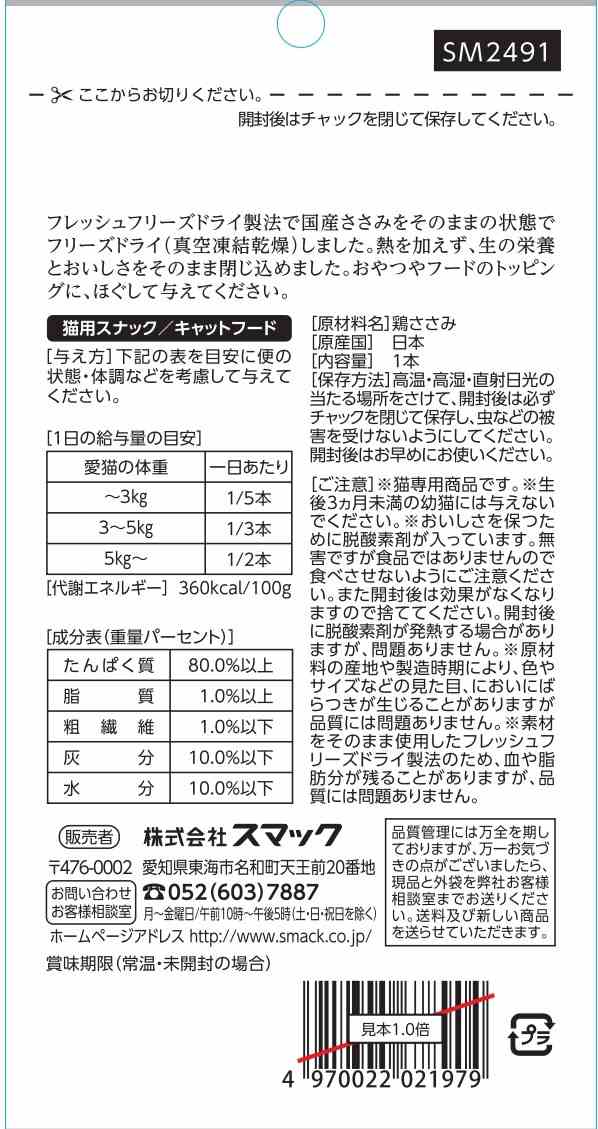 スマック独自のフレッシュフリーズドライ製法で国産の食品用ささみ(ヒューマングレード)をそのままの状態でフリーズドライしました。熱を加えず、生の栄養とおいしさをそのまま閉じこめました。おやつやフードのトッピングに、ほぐして与えてください。