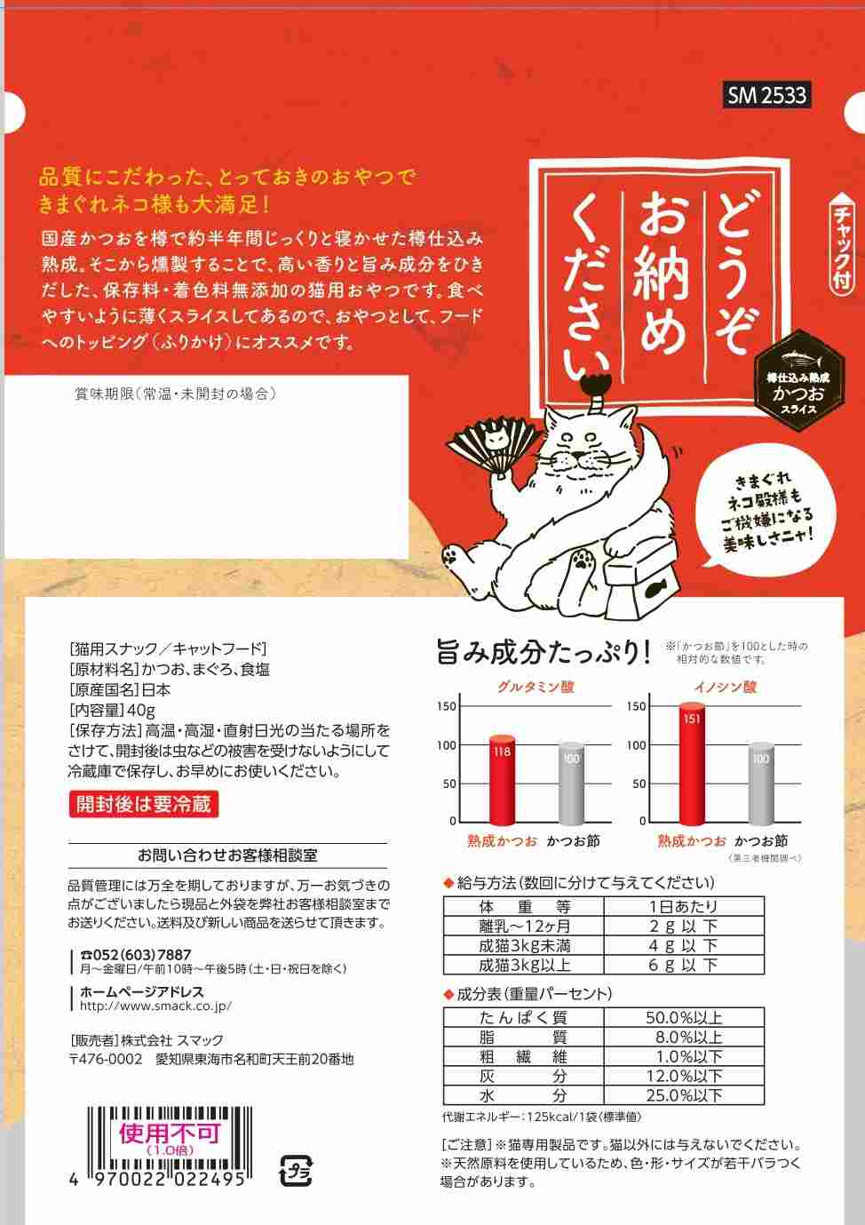 国産かつおを樽で約半年間じっくりと寝かせた樽仕込み熟成。そこから燻製することで高い香りと旨み成分をひき出した、保存料・着色料無添加の猫用おやつです。食べやすいように薄くスライスしてあるので、おやつとして、フードへのトッピング(ふりかけ)にオススメです。