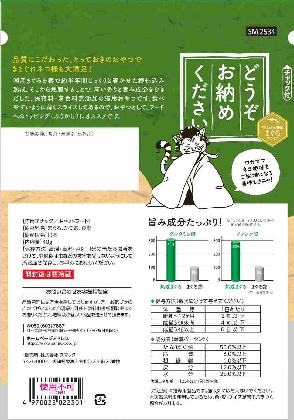 国産まぐろを樽で約半年間じっくりと寝かせた樽仕込み熟成。そこから燻製することで高い香りと旨み成分をひき出した、保存料・着色料無添加の猫用おやつです。食べやすいように薄くスライスしてあるので、おやつとして、フードへのトッピング(ふりかけ)にオススメです。