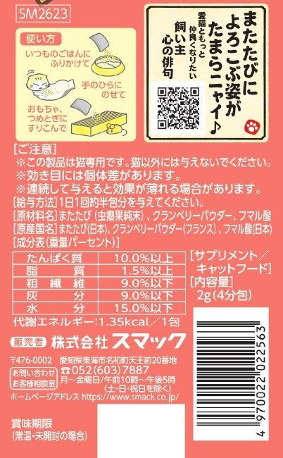 「猫にまたたび」と言うように、昔から愛猫家に重宝がられているまたたびの粉末。スマックではまたたびの実の中でも、猫が喜ぶ有効成分が通常の実よりも多く含まれている厳選した実『虫エイ果(ちゅうえいか)』の純末を使用しています。 下部尿路の健康維持のために、クランベリー・フマル酸を配合しました。