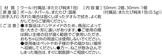 猫用おもちゃの「じゃれボール」は天然素材の羊毛(ウール)を100%使用。ネパールでひとつひとつ丁寧にハンドメイドで仕上げました。転がるボールにねこちゃんも大喜び♪ねこちゃんの本能を呼び覚まします。またたび純末のおまけ付きです。
