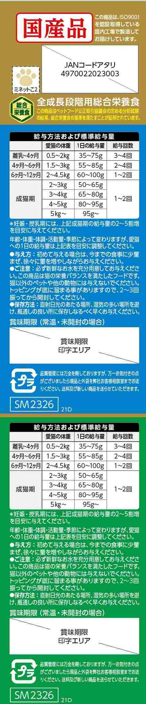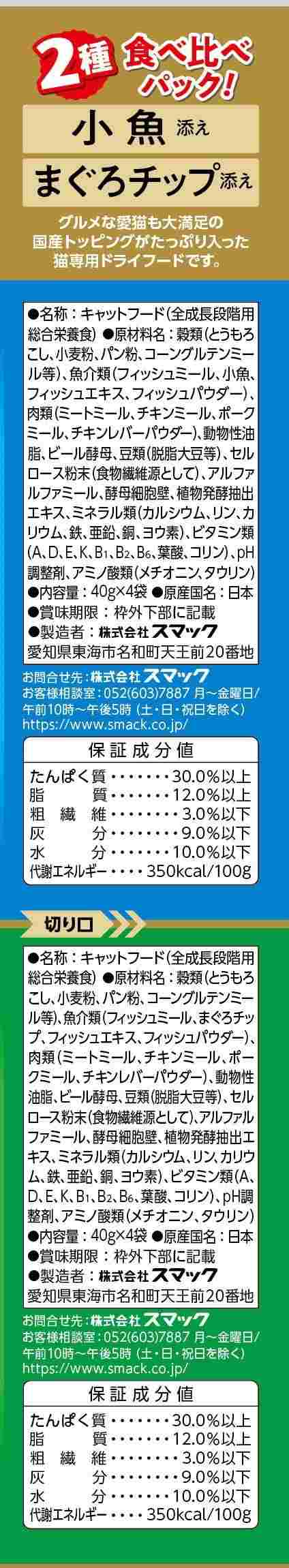 【小魚】穀類(とうもろこし、小麦粉、パン粉、コーングルテンミール等)、魚介類(フィッシュミール、小魚、フィッシュエキス、フィッシュパウダー)、肉類(ミートミール、チキンミール、ポークミール、チキンレバーパウダー)、動物性油脂、ビール酵母、豆類(脱脂大豆等)、セルロース粉末(食物繊維源として)、アルファルファミール、酵母細胞壁、植物発酵抽出エキス、ミネラル類(カルシウム、リン、カリウム、鉄、亜鉛、銅、ヨウ素)、ビタミン類(A、D、E、K、B1、B2、B6、葉酸、コリン)、pH調整剤、アミノ酸類(メチオニン、タウリン)【まぐろチップ】穀類(とうもろこし、小麦粉、パン粉、コーングルテンミール等)、魚介類(フィッシュミール、まぐろチップ、フィッシュエキス、フィッシュパウダー)、肉類(ミートミール、チキンミール、ポークミール、チキンレバーパウダー)、動物性油脂、ビール酵母、豆類(脱脂大豆等)、セルロース粉末(食物繊維源として)、アルファルファミール、酵母細胞壁、植物発酵抽出エキス、ミネラル類(カルシウム、リン、カリウム、鉄、亜鉛、銅、ヨウ素)、ビタミン類(A、D、E、K、B1、B2、B6、葉酸、コリン)、pH調整剤、アミノ酸類(メチオニン、タウリン)