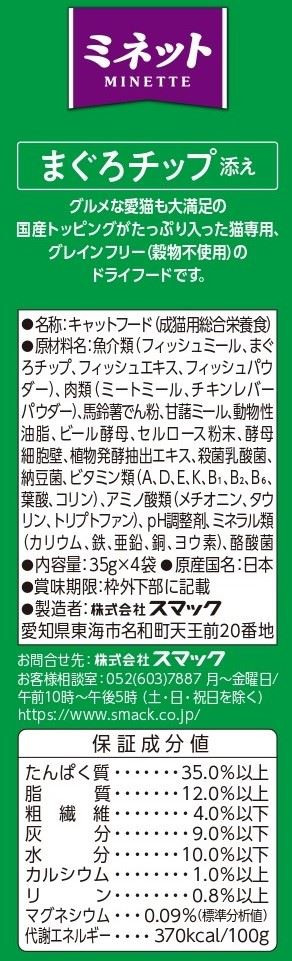 魚介類(フィッシュミール、まぐろチップ、フィッシュエキス、フィッシュパウダー)、肉類(ミートミール、チキンレバーパウダー)、馬鈴薯でん粉、甘藷ミール、動物性油脂、ビール酵母、セルロース粉末、酵母細胞壁、植物発酵抽出エキス、殺菌乳酸菌、納豆菌、ビタミン類(A、D、E、K、B1、B2、B6、葉酸、コリン)、アミノ酸類(メチオニン、タウリン、トリプトファン)、pH調整剤、ミネラル類(カリウム、鉄、亜鉛、銅、ヨウ素)、酪酸菌