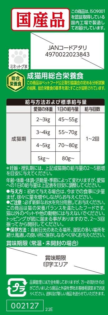 【たんぱく質】35.0%以上【脂質】12.0%以上【粗繊維】4.0% 以下【灰分】9.0%以下【水分】10.0%以下【カルシウム】1.0%以上【リン】0.8%以上【マグネシウム】0.09%(標準分析値)